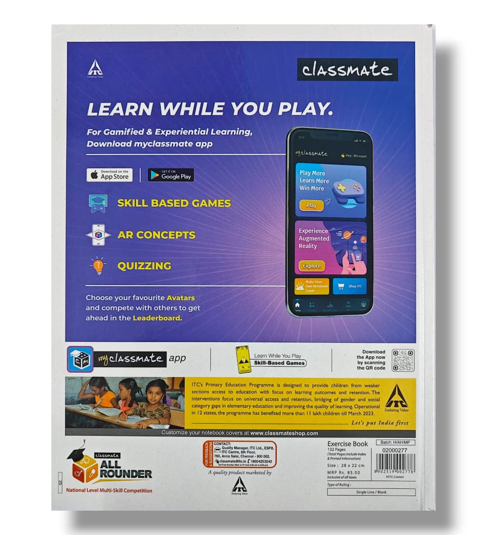 Classmate Chemistry Practical Notebook, with 132 pages measuring 28 x 22 cm, is your go-to companion for organized note-taking during classes or lectures with free blue and black ink . Whether you prefer single-line or blank pages, this notebook offers versatility to suit your needs. What's more, Classmate's commitment to eco-friendliness shines through with elemental chlorine-free paper, ensuring your notes are not only of high quality but also environmentally responsible.