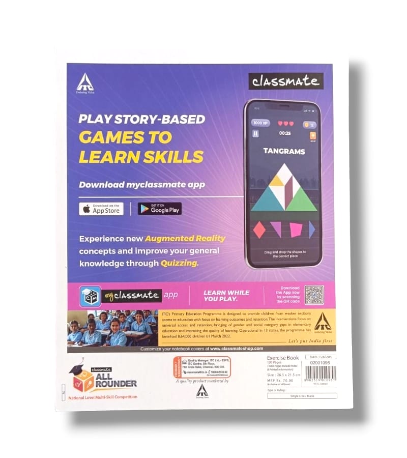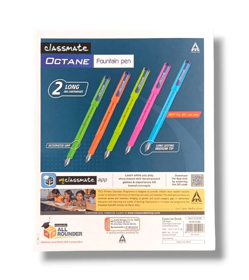 Classmate Computer Practical Notebook, with 100 pages measuring 26.5 x 21.5 cm, is your go-to companion for organized note-taking during classes or lectures with free blue and black ink ball pen. Whether you prefer single-line or blank pages, this notebook offers versatility to suit your needs. What's more, Classmate's commitment to eco-friendliness shines through with elemental chlorine-free paper, ensuring your notes are not only of high quality but also environmentally responsible.
